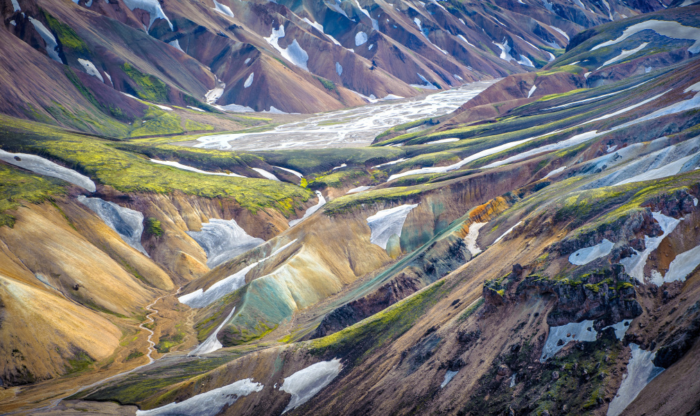 The colours of Landmannalaugar: Dubbed the “Coloured Mountains”, rhyolite rocks oxidise into hues of yellow, red, green, and blue, resembling an overturned palette of earth tones.